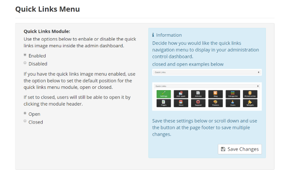 From within the general settings section, the web-site administrator can adjust the following quick links menu setting options.