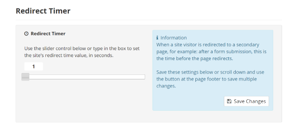 From within the general settings section, the web-site administrator can adjust the following redirect timer setting options.