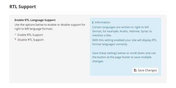 From within the general settings section, the web-site administrator can adjust the following RTL (right to left) language support setting options.