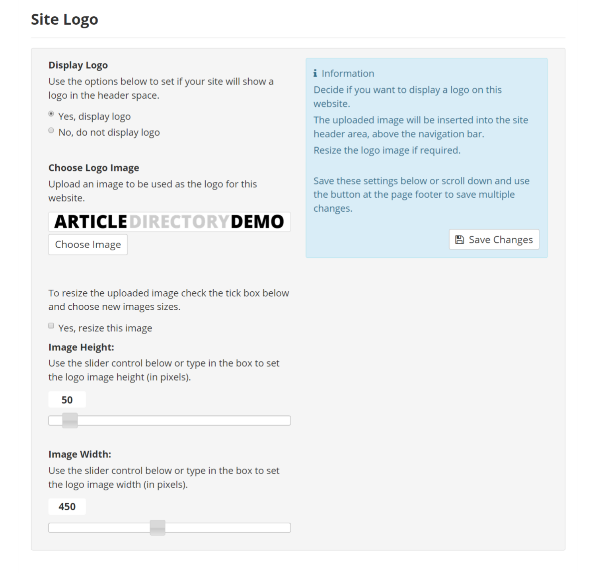 From within the general settings section, the web-site administrator can adjust the following web-site logo setting options.