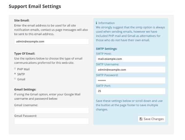 • Type of mail to use for web-site support: SMTP, PHP Mail or Gmail.