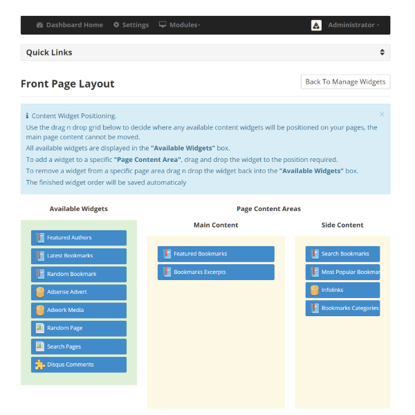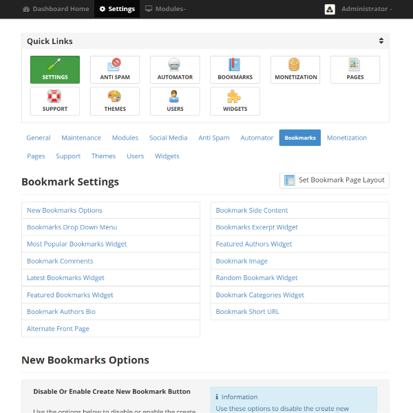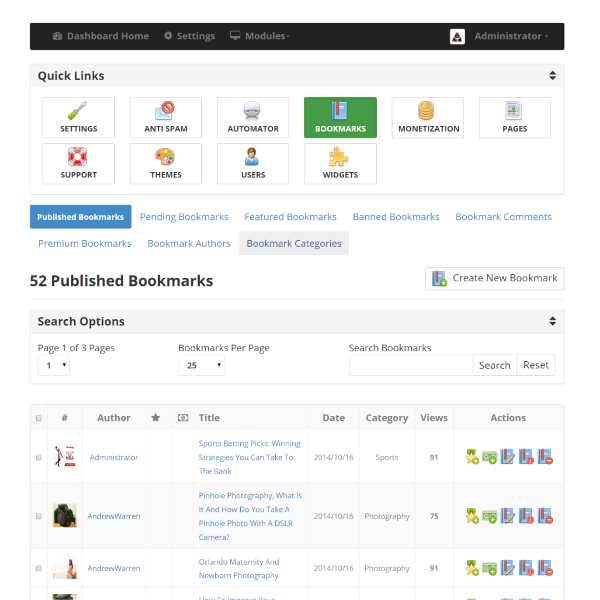 Every aspect of your social bookmarking web-site, bookmark authors and submitted bookmarks can be controlled via the administration control panel.